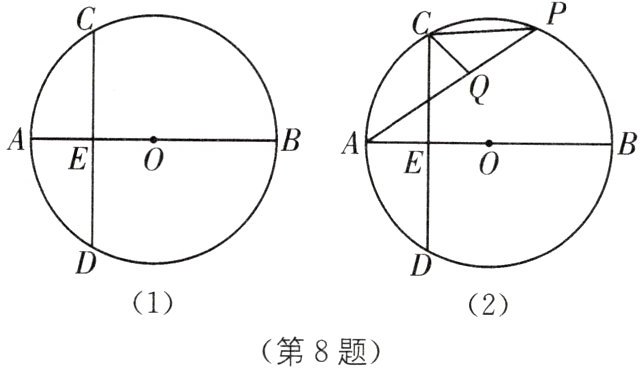 8. (2024·杭州上城区采荷实验中学二模)如图(1),AB是$\odot O$的直径,E是OA的中点,$OA= 2$,过点E作$CD⊥AB交\odot O$于C,D两点.