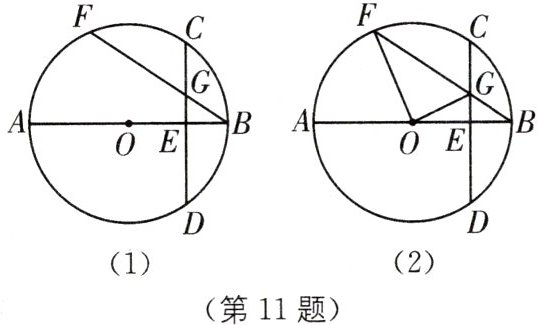 11. 垂径定理模型如图(1),AB为$\odot O$的直径,$CD⊥AB$于点E,$\widehat {CF}= \widehat {CB}$,BF与CD交于点G.