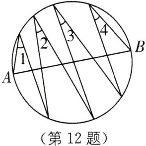 12. (2024·连云港中考)如图,AB是圆的直径,$∠1,∠2,∠3,∠4$的顶点均在AB上方的圆弧上,$∠1,∠4$的一边分别经过点A,B,则$∠1+∠2+∠3+∠4= $