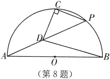 8. 动点定圆模型(广东广州前六高中自主招生)如图,已知以AB为直径的$\odot O$,C为$\overset{\frown }{AB}$的中点,P为$\overset{\frown }{BC}$上任意一点,$CD⊥CP$交AP于点D,连接BD,若$AB= 6$,则BD的最小值为______.