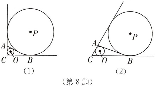 8. 在$△ABC$中,$∠C= α$,设$BC= a,AC= b,AB= c.\odot O是△ABC$的内切圆,$\odot P$分别与CA的延长线、CB的延长线以及直线AB均只有一个公共点,$\odot O$的半径为m,$\odot P$的半径为n.