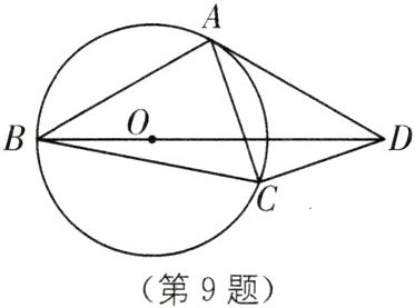 9. (2025·湖北武汉汉阳区期末)如图,在$△ABC$中,$∠BAD= 120^{\circ },AB= \sqrt {3}$,点O在BD上,以A为切点,AD为切线的$\odot O$经过点A,点C在$\odot O$上,且$∠BCD= 150^{\circ }$,则AC的长是____.