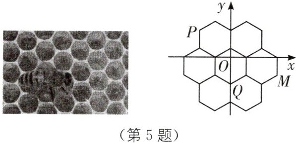 5. 新情境 蜂巢结构 (2023·山西中考)蜂巢结构精巧,其巢房横截面的形状均为正六边形.如图是部分巢房的横截面图,图中7个全等的正六边形不重叠且无缝隙,将其放在平面直角坐标系中,点 $P,Q,M$ 均为正六边形的顶点.若点 $P,Q$ 的坐标分别为 $(-2\sqrt{3},3),(0,-3)$,则点 $M$ 的坐标为(