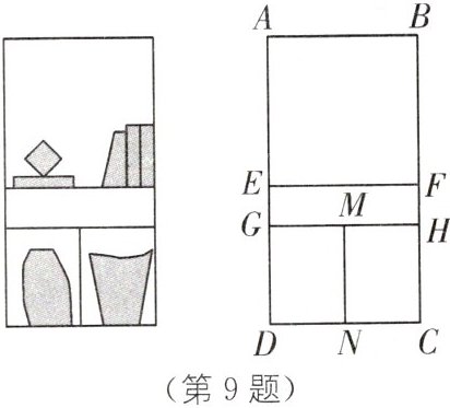 9. (福建泉州华侨中学自主招生)用总长680cm的木板制作矩形置物架ABCD(如图),已知该置物架上面部分为正方形ABFE,下面部分是两个全等的矩形DGMN和矩形CNMH,中间部分为矩形EFHG.已知$DG= 60cm$,设正方形的边长$AB= xcm$.