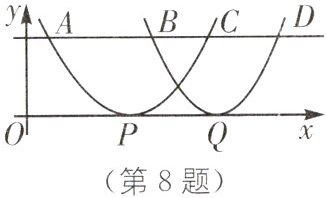 8. (2025·浙江温州期中)在平面直角坐标系中,两个二次函数图象的顶点$P,Q皆在x$轴上,直线$AD平行于x$轴,且与两图象相交于$A,C,B,D$四点,且$AB > CD > BC$,各点位置如图所示,若$AB = 10,PQ = 8$,则$CD$的长度为(