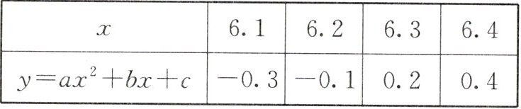 $6.3<x<6.4$ [解析]一元二次方程$ax^{2}+bx + c=\frac {3}{10}$$(a≠0)$的解即为$y = ax^{2}+bx + c = 0.3=\frac {3}{10}$时x的值.由表可知,当$6.3<x<6.4$时,函数$y = ax^{2}+bx + c$取得$y = ax^{2}+bx + c = 0.3=\frac {3}{10}$,