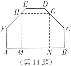14. 中考新考法 面积最值问题 (2023·潍坊中考)工匠师傅准备从六边形的铁皮ABCDEF中,裁出一块矩形铁皮制作工件,如图所示.经测量,$AB// DE$,AB与DE之间的距离为2米,$AB= 3$米,$AF= BC= 1$米,$∠A= ∠B= 90^{\circ },∠C= ∠F= 135^{\circ }$.MH,HG,GN是工匠师傅画出的裁剪虚线.当MH的长度为多少时,矩形铁皮MNGH的面积最大?最大面积是多少?