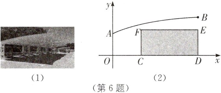 6. (2024·甘肃中考)如图(1)为一汽车停车棚,其棚顶的横截面可以看作是抛物线的一部分,如图(2)是棚顶的竖直高度y(单位:m)与距离停车棚支柱AO的水平距离x(单位:m)近似满足函数关系$y= -0.02x^{2}+0.3x+1.6$的图象,点$B(6,2.68)$在图象上. 若一辆厢式货车需在停车棚下避雨,货车截面看作长$CD= 4m$,高$DE= 1.8m$的矩形,则可判定货车____