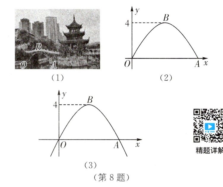 8. 传统文化 甲秀楼 甲秀楼是贵阳的地标建筑,建于明万历年间,已有400多年历史. 如图(1),甲秀楼的桥拱截面OBA可视为抛物线的一部分,在某一时刻,桥拱内的水面宽$OA= 8m$,桥拱顶点B到水面的距离是4m.