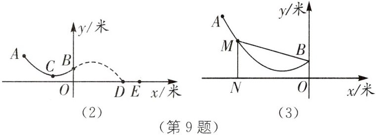 9. 新情境 研究水滑道路径 (2024·赤峰中考)如图(1),是某公园的一种水上娱乐项目. 数学兴趣小组对该项目中的数学问题进行了深入研究. 下面是该小组绘制的水滑道截面图,如图(2),人从点A处沿水滑道下滑至点B处腾空飞出后落入水池.以地面所在的水平线为x轴,过腾空点B与x轴垂直的直线为y轴,O为坐标原点,建立平面直角坐标系. 他们把水滑道和人腾空飞出后经过的路径都近似看作是抛物线的一部分. 根据测量和调查得到的数据和信息,设计了以下三个问题,请你解决.