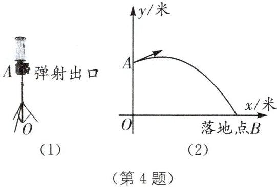 4. (2025·河南郑州期末)某校羽毛球馆有一架高度可调的羽毛球发球机,如图(1),发球机固定在地面点O处,其弹射出口记为点A,羽毛球的运动路径呈抛物线状,如图(2),设飞行过程中羽毛球与发球机的水平距离为x(米),到地面的高度为y(米),y与x的部分对应数据如表所示.