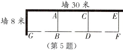 5. 方程思想(2025·上海浦东新区期末)一经营者要把如图所示的区域分隔成三个面积相同的商铺出租.已知铺面两面靠墙,墙长分别为8米和30米,三间商铺都在沿街开一个1米宽的门.经营者共用去板材45米(不计损耗).