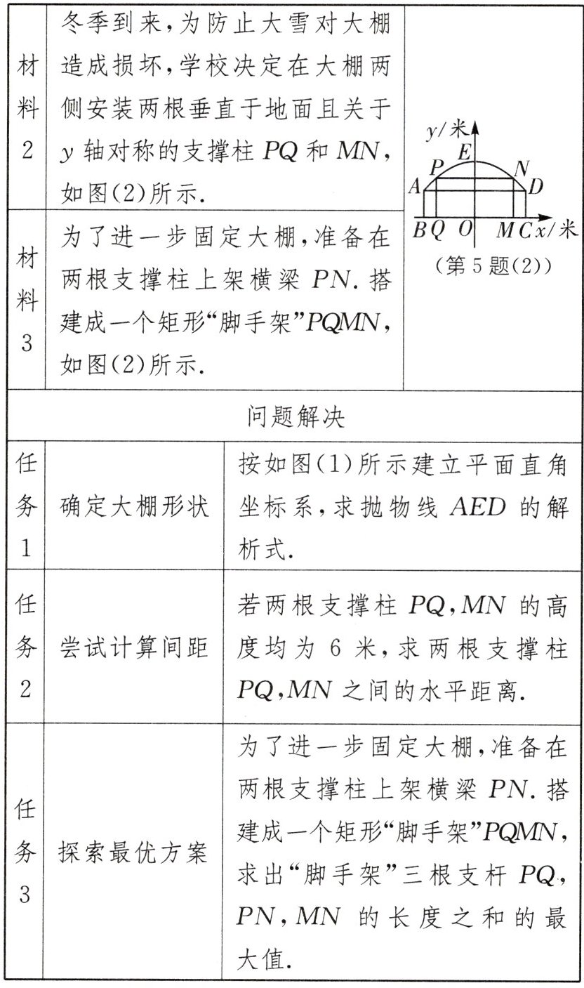 任务3:设点N坐标为(m, -$\frac{1}{9}m^{2} + 7$),0 < m < 6,PQ,PN,MN的长度之和为w米,则PN = 2m,PQ = MN = -$\frac{1}{9}m^{2} + 7$,