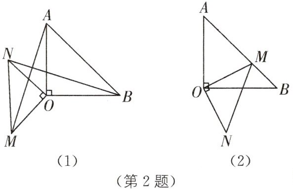 2. 已知 $ △AOB $ 和 $ △MON $ 都是等腰直角三角形 $ (\frac{\sqrt{2}}{2}OA < OM < OA) $,$ ∠AOB = ∠MON = 90^{\circ} $。
