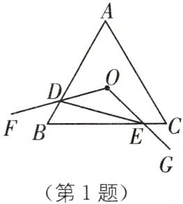 1. 如图,等边三角形 $ ABC $ 的边长为 4,点 $ O $ 是 $ △ABC $ 的中心,$ ∠FOG = 120^{\circ} $,绕点 $ O $ 旋转 $ ∠FOG $,分别交线段 $ AB $,$ BC $ 于 $ D $,$ E $ 两点,连接 $ DE $,给出下列四个结论:① $ OD = OE $;② $ S_{△ODE} = S_{△BDE} $;③ 四边形 $ ODBE $ 的面积始终等于 $ \frac{4\sqrt{3}}{3} $;④ $ △BDE $ 周长的最小值为 6。上述结论中正确的个数是( )。