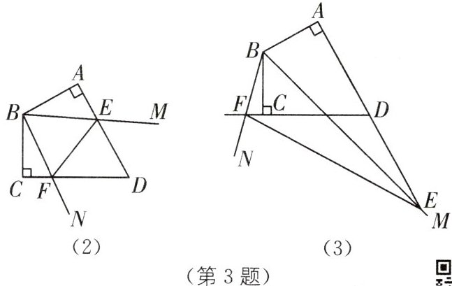 3. 如图,在四边形 $ ABCD $ 中,$ AB ⊥ AD $,$ BC ⊥ CD $,$ AB = BC $,$ ∠ABC = 120^{\circ} $,$ ∠MBN = 60^{\circ} $,$ ∠MBN $ 绕点 $ B $ 旋转,它的两边分别交 $ AD $,$ DC $(或它们的延长线)于点 $ E $,$ F $。