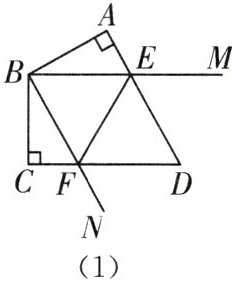 (1) 当 $ ∠MBN $ 绕点 $ B $ 旋转到 $ AE = CF $ 时(如图(1)),$ AE $,$ CF $,$ EF $ 之间的数量关系为______。