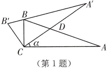 1.[全国初中数学竞赛(山东赛区)预赛]在$△ABC$中,$∠ACB= 90^{\circ },∠A= 20^{\circ }$,如图,将$△ABC$绕点 C 按逆时针方向旋转角α到$△A'B'C$的位置,其中$A',B'$分别是 A,B 的对应点,B 在$A'B'$上,$CA'$交 AB 于点 D,则$∠BDC$的度数为(