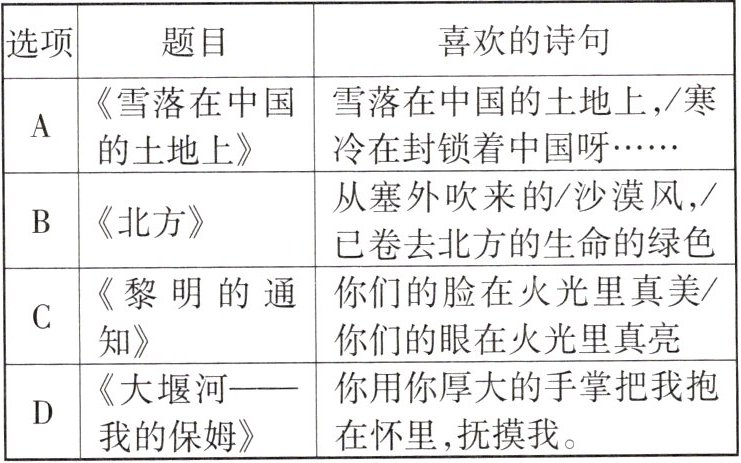 C 【解析】C. “你们的脸在火光里真美/你们的眼在火光里真亮”是《火把》中的诗句,不是《黎明的通知》中的诗句。故选 C。