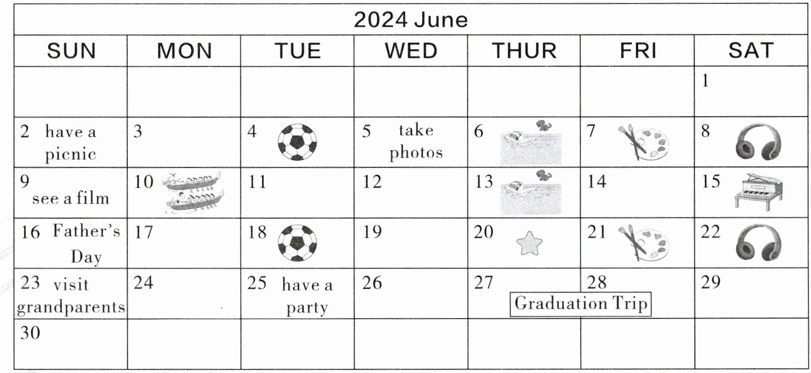 (A)阅读 John 今年六月份的备忘日历,判断下列句子与备忘日历的内容是否相符,相符的写“T”,不相符的写“F”。