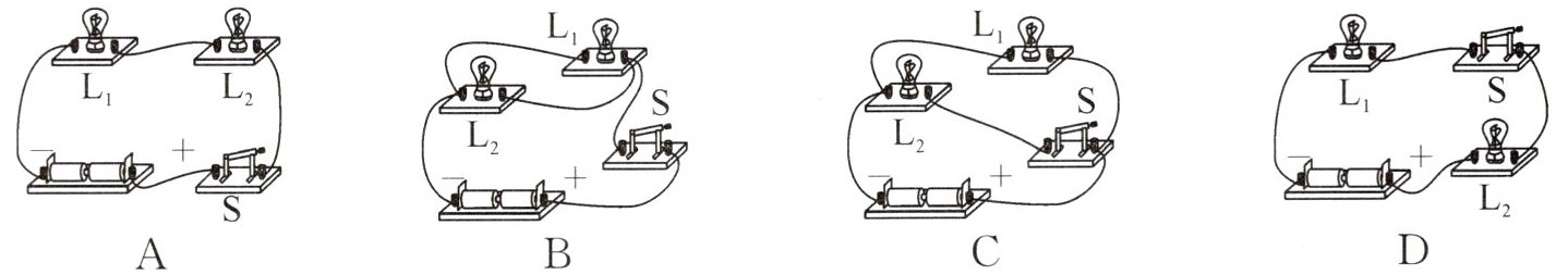 【解析】:根据电路图,电流从电源正极流出,依次经过$L_{1}$、开关$S$、$L_{2}$,最后回到电源负极。连接实物图时,先将三节电池串联组成电源,然后从电源正极开始,用导线依次连接$L_{1}$的一个接线柱、开关$S$的一个接线柱、$L_{2}$的一个接线柱,再将$L_{1}$的另一个接线柱与开关$S$的另一个接线柱连接,$L_{2}$的另一个接线柱与电源负极连接。