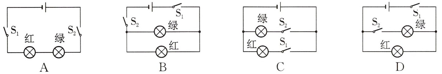 7. (2024·淄博)为停车场设计“车位占用”提醒模拟电路,要求车位被占用时,该车位上方只有红色指示灯亮;车位未被占用时,上方只有绿色指示灯亮.下列电路能实现上述要求的是 (
