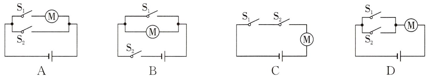 10. (2023·枣庄)喜爱物理的小明想设计一个双钥匙电动安全锁,这里钥匙相当于“开关”,要求是两把钥匙同时使用(开关闭合)才能开锁,以下符合设计要求的电路图是 (