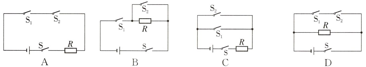 9. 给某型号电烤箱设定好工作时间和温度,即闭合定时开关 $ S_{1} $ 和温控开关 $ S_{2} $,再闭合启动开关 $ S $,电烤箱开始工作.当达到了设定的工作时间或温度时,定时开关 $ S_{1} $ 或温控开关 $ S_{2} $ 断开,电烤箱就停止工作.下列电路符合要求的是 (