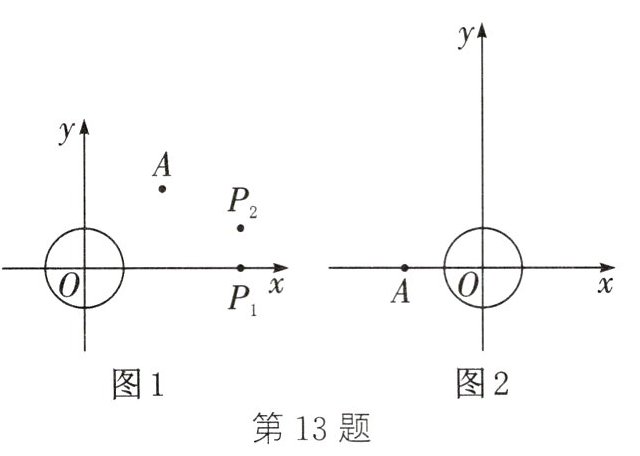13. (2024·盱眙县期中)在平面直角坐标系 xOy 中,$\odot O$的半径为 1,对于点 P、点 A 和$\odot O$,给出下面定义:将点 P 绕点 A 顺时针旋转$90^{\circ }$得到点$P'$,若点$P'$在$\odot O$上或内部,则称点 P 为$\odot O$关于点 A 的旋垂点.