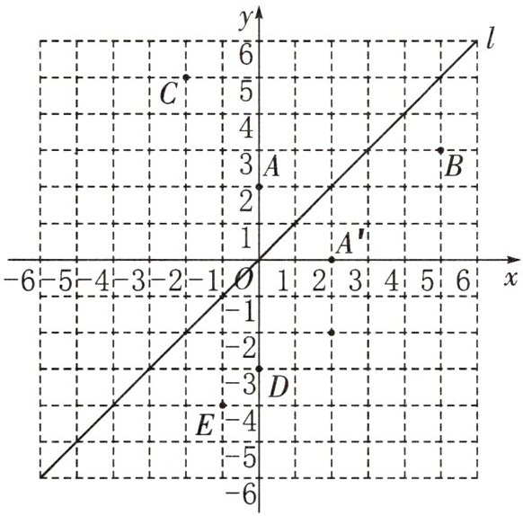 由图观察易知$A(0,2)$关于直线$l$的对称点$A'$的坐标为$(2,0)$,请在图中分别标明$B(5,3)$,$C(-2,5)$关于直线$l$的对称点$B'$,$C'$的位置,并写出它们的坐标:$B'$______