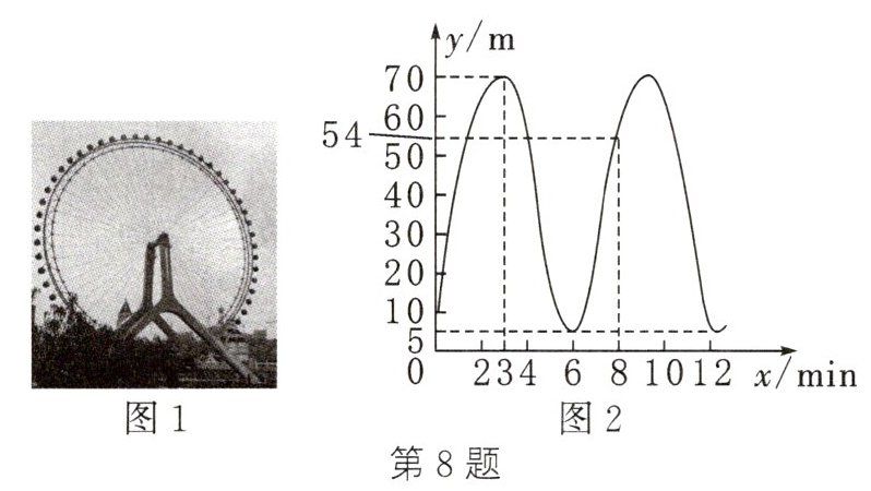 8. (2024秋·中原区期中)8月29日,郑州市人民公园的标志性建筑摩天轮正式拆除,这座陪我们走过数个四季的钢铁“彩虹”满载了老郑州人们难忘珍贵的童年回忆,图1中的摩天轮可抽象成一个圆,圆上一点离地面的高度y(m)与旋转时间x(min)之间的关系如图2所示,则摩天轮的直径为______