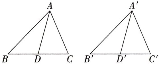 证明: $ \because A D, A ^ { \prime } D ^ { \prime } $ 分别是 $ \triangle A B C, \triangle A ^ { \prime } B ^ { \prime } C ^ { \prime } $ 的中线, $ B C = B ^ { \prime } C ^ { \prime }, \therefore B D = \frac { 1 } { 2 } B C, B ^ { \prime } D ^ { \prime } = \frac { 1 } { 2 } B ^ { \prime } C ^ { \prime } $, $ \therefore B D = B ^ { \prime } D ^ { \prime } $, 在 $ \triangle A B D $ 和 $ \triangle A ^ { \prime } B ^ { \prime } D ^ { \prime } $ 中, $ \left\{ \begin{array} { l } { A B = A ^ { \prime } B ^ { \prime }, } \\ { A D = A ^ { \prime } D ^ { \prime }, } \\ { B D = B ^ { \prime } D ^ { \prime }, } \end{array} \right. $ $ \therefore \triangle A B D \cong \triangle A ^ { \prime } B ^ { \prime } D ^ { \prime } $(