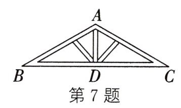 7. 如图,屋顶钢架外框是等腰三角形,其中 $ AB = AC $,立柱 $ AD \perp BC $,且顶角 $ \angle BAC = 120^{\circ} $,则 $ \angle C $ 的大小为