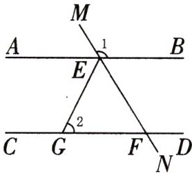 $ \because AB // CD$,$ \therefore \angle MFD = \angle 1 = 122^{\circ}$,$ \angle MFD = \angle AEF$,$ \angle 2 = \angle AEG$。$ \because GE = GF$,$ \therefore \angle GFE = \angle GEF = 180^{\circ} - \angle MFD = 180^{\circ} - 122^{\circ} = 58^{\circ}$,$ \therefore \angle 2 = 180^{\circ} - 58^{\circ} - 58^{\circ} = 64^{\circ}$。