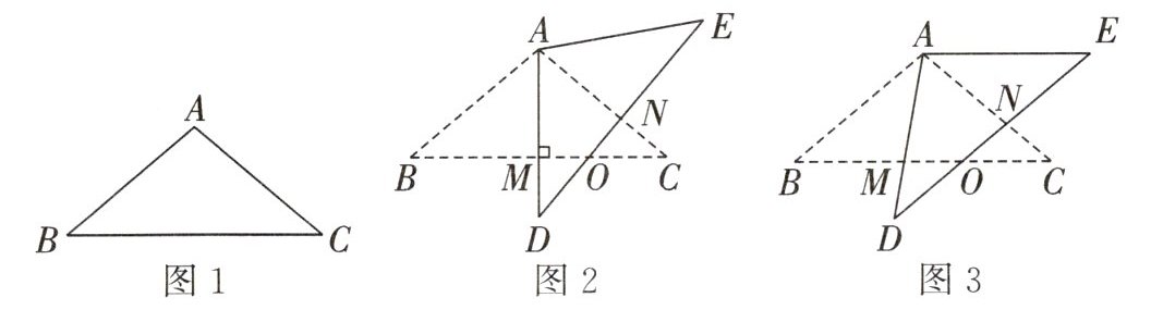 16. (2024 春·二七区期末)问题情境:活动课上,同学们以等腰三角形为背景展开有关图形旋转的探究活动,如图 1,已知 $ \triangle ABC $ 中,$ AB = AC $,$ \angle B = 40^{\circ} $。将 $ \triangle ABC $ 从图 1 的位置开始绕点 $ A $ 逆时针旋转,得到 $ \triangle ADE $ (点 $ D $,$ E $ 分别是点 $ B $,$ C $ 的对应点),旋转角为 $ \alpha (0^{\circ} \lt \alpha \lt 100^{\circ}) $,设线段 $ AD $ 与 $ BC $ 相交于点 $ M $,线段 $ DE $ 分别交 $ BC $,$ AC $ 于点 $ O $,$ N $。