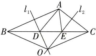 9. (2025 春·射阳县阶段考)如图,已知在$\triangle ABC$中,$AB$边的垂直平分线$l_{1}$交$BC$于点$D$,$AC$边的垂直平分线$l_{2}$交$BC$于点$E$,$l_{1}$与$l_{2}$相交于点$O$,连接$OB$,$OC$,若$\triangle ADE$的周长为$8cm$,$\triangle OBC$的周长为$18cm$.