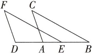 $∵ DA = EB$,$∴ DE = AB$,在 $△DEF$ 和 $△ABC$ 中,$\left\{ \begin{array} { l } { EF = BC, } \\ { DF = AC, } \\ { DE = AB, } \end{array} \right. ∴ △DEF ≌ △ABC ( SSS )$