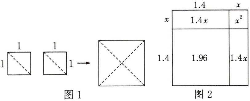 (1)探究过程:因为$1.4^{2}=1.96,1.5^{2}=2.25$,所以$1.4<\sqrt{2}<1.5$.设$\sqrt{2}=1.4+x$,将边长为$\sqrt{2}$的正方形分成如图2所示的四部分.由面积公式,可得$x^{2}+2.8x+1.96=2$,因为$x$值很小,所以$x^{2}$更小,略去$x^{2}$,解得$x\approx0.014$(保留到0.001),即$\sqrt{2}\approx$______.
