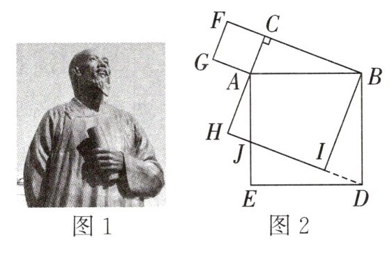 7. (2024秋·苏州期末)勾股定理是数学史上的一颗璀璨明珠.被誉为清代“历算第一名家”的著名数学家梅文鼎先生(图1)在《梅氏丛书辑要》(由其孙子梅毂成编纂)的“勾股举隅”卷中给出了多种勾股定理的证法.其中一种是在图2的基础上,运用“出入相补”原理完成的.在△ABC中,∠ACB=90°,四边形ABDE,ACFG,BCHI均为正方形,HI与AE相交于点J,可以证明点D在直线HI上.若△AHJ,△DEJ的面积分别为2和6,求直角边AC的长.
