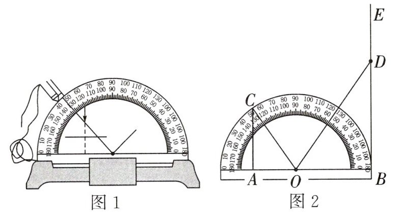 6. (2025春·甘井子区阶段考)小丽在物理实验课上利用如图1所示"光的反射演示器"直观呈现了光的反射原理.如图2,她用激光笔从量角器左边边缘点C处发出光线,经量角器圆心O处(此处放置平面镜)反射后,反射光线落在右边光屏BE上的点D处(B也在量角器的边缘上,O为量角器的中心,A,O,B三点共线,$CA\perp AB$,$BE\perp AB$).小丽在实验中还记录下了$AC=8cm$,$AB=16cm$.依据记录的数据,求量角器的半径OB长.
