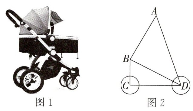 10. (2025春·思明区期中)图1是某品牌婴儿车,图2为其简化结构示意图.根据安全标准需满足$AB\perp BD$,现测得$AB=CD=6dm$,$BC=3dm$,$AD=9dm$,其中BC与CD之间由一个固定为$90^{\circ}$的零件连接(即$∠BCD=90^{\circ}$),通过计算说明该车是否符合安全标准.