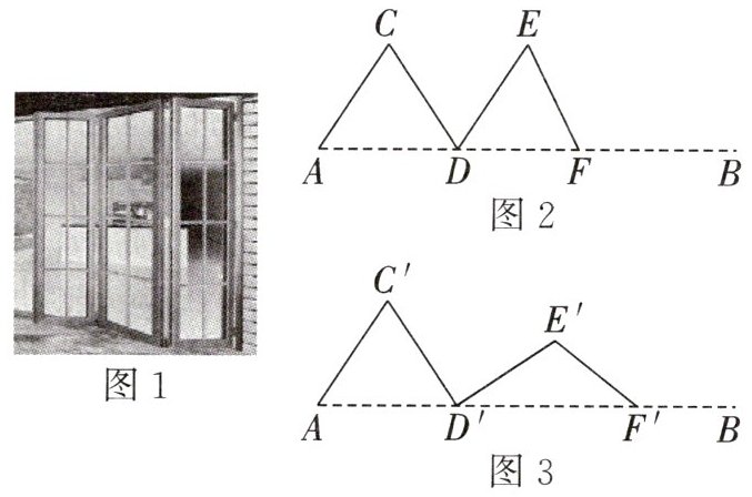 9. (2024秋·宿迁期末)如图1是由四片门扇连接成的折叠门,轨道装在天花板上,图2是示意图.已知轨道$AB=110cm$,在推拉合页C或E时,滚轮D,F在轨道上移动,门完全关上时,门扇恰好贴合整条轨道.已知每小片门扇宽度均相等,则$AC=CD=DE=EF$.刚开始门扇叠合在左边,第一次向右拉开门扇,位置如图2时,$AC// DE$,$∠A=60^{\circ}$,此时门被关上部分的长AF;接着继续向右拉门扇,位置如图3时,$∠C'D'E'=90^{\circ}$,$AD':D'F'=6:8$,此时门被关上部分的长$AF'$,那么$AF'$比AF长多少厘米?