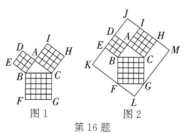 16. 勾股定理是几何中的一个重要定理.在我国古算书《周髀算经》中就有"若勾三,股四,则弦五"的记载.如图1是由边长相等的小正方形和直角三角形构成的,可以用其面积关系验证勾股定理.图2是由图1放入矩形内得到的,$ \angle BAC = 90^{\circ} $,$ AB = 3 $,$ AC = 4 $,点D,E,F,G,H,I都在矩形KLMJ的边上,则空白部分的面积为