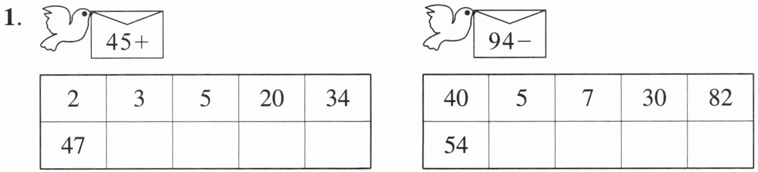 $15 + 9\bigcirc20 + 4$ $63 + 8\bigcirc89 - 20$ $45 + 30\bigcirc82 - 8$