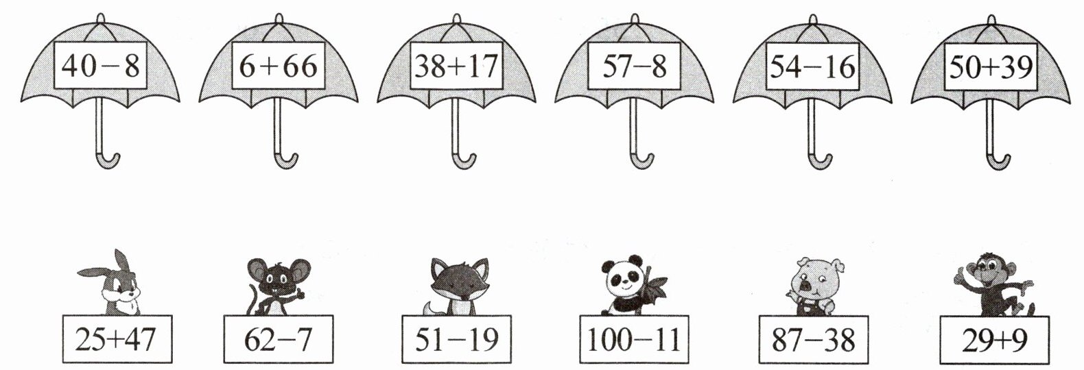 三、下雨啦,小动物该打哪把伞?(连一连)