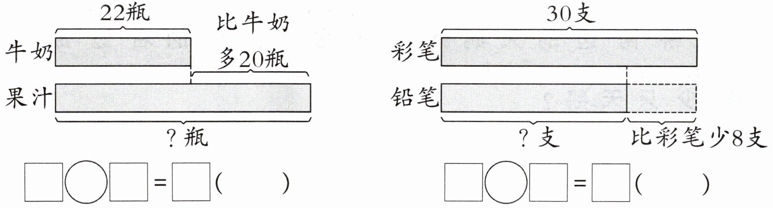 22 + 20 = 42(瓶) 30 - 8 = 22(支)
