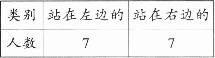 按大人和孩子分,总人数为 $ 8 + 6 = 14 $;按性别分,总人数为 $ 7 + 7 = 14 $;按站的方位分,总人数为 $ 7 + 7 = 14 $;按是否戴帽子分,总人数为 $ 2 + 12 = 14 $。由此可以看出,分类标准不同,结果可能不同,但总数不变。