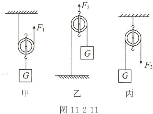 11. (2023扬州月考)如图11-2-11甲、乙、丙所示,利用三个质量相同的滑轮提起相同质量的重物时,所需拉力分别为$F_{1}$、$F_{2}和F_{3}$,不计绳重和摩擦,若滑轮和重物的重力分别为2N和10N,匀速提升重物G时,拉力最大的是____;拉力最小的是____,(前两空均选填“$F_{1}$”“$F_{2}$”或“$F_{3}$”)最小拉力为____