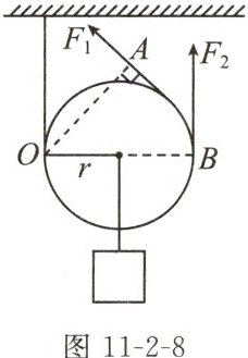 8. (2023无锡滨湖区月考)如图11-2-8所示,小明在“探究动滑轮工作特点”的实验中,滑轮第一次受到力$F_{1}$的作用,第二次受到竖直向上的力$F_{2}$的作用,物体都被匀速向上提起。已知物体重力为$G_{物}$。若不计摩擦和绳重,则下列说法正确的是 (