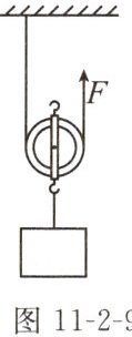 9. 如图11-2-9所示,用力F将重为120N的物体匀速提升0.2m,不计动滑轮重、绳重和摩擦,则拉力$F= $____N,绳子自由端移动的距离$s= $____m。若拉力F为70N,则动滑轮重为____N(不计绳重和摩擦)。若改为斜向上拉绳子,同样使物体匀速上升,则拉力F的大小将____(选填“变大”“变小”或“不变”)。